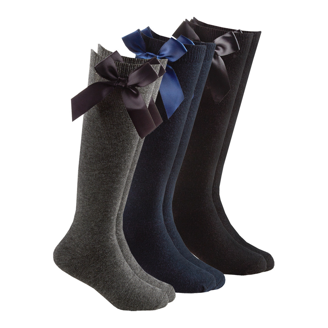 👏Hey there, fashion lovers! Girls High Knee With Satin Bow Back To School Plain Socks 3 Pairs - Black Grey Navy🎁