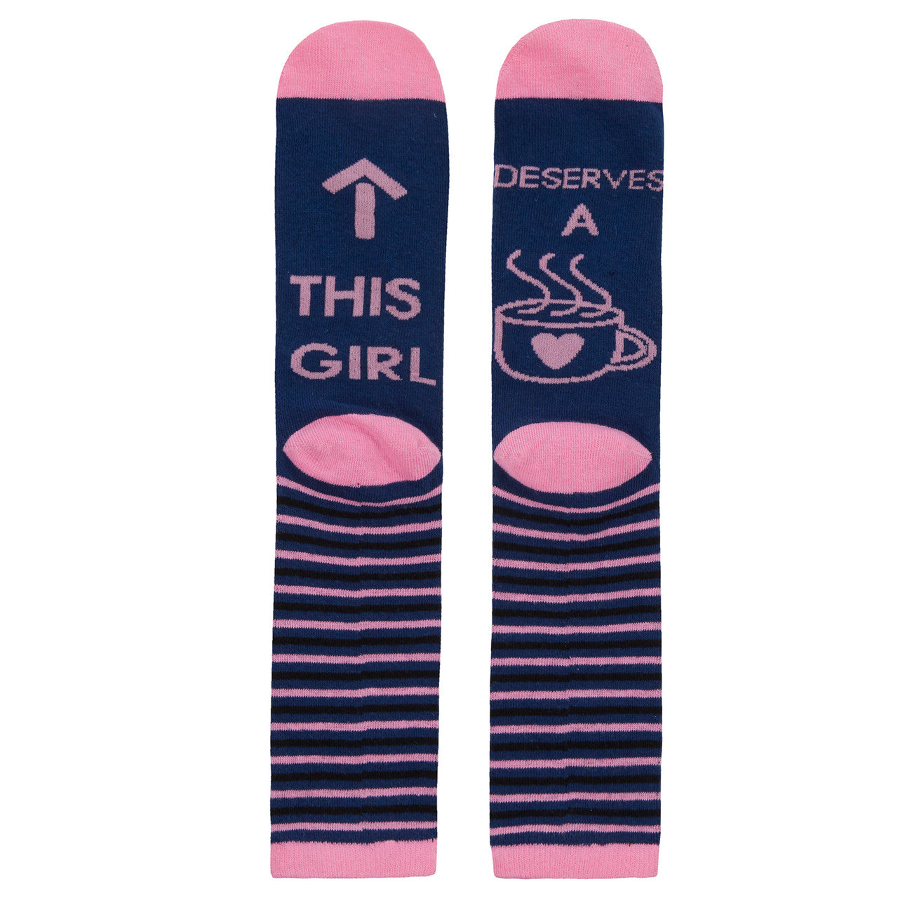These cosy, novelty socks are sure to put a smile on your face. Featuring fun slogan 'This Girl Deserves A Coffee' and a striped pattern in navy and pink colourway. These women's funky socks are made of soft, cotton rich material with added elastane for all day comfort. Material Composition78% Cotton 20% Polyester 2% Elastane 🏬 Shop now!